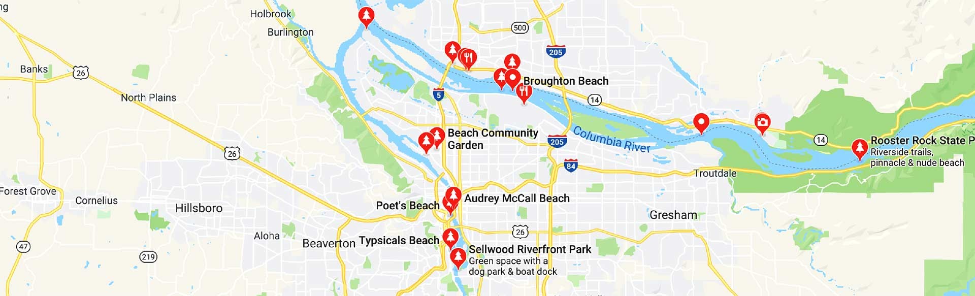 With so much sandy beachfront and a wonderful view of the Columbia River, this is one of the best beaches in the Portland area. There’s little shade but it doesn’t get quite as crowded as other Sauvie Island beaches – partly due to the semi hidden parking lot at the end of a dirt road off Reeder Road. Columbia Riverkeeper volunteers monitor water quality at this beach from May-September.