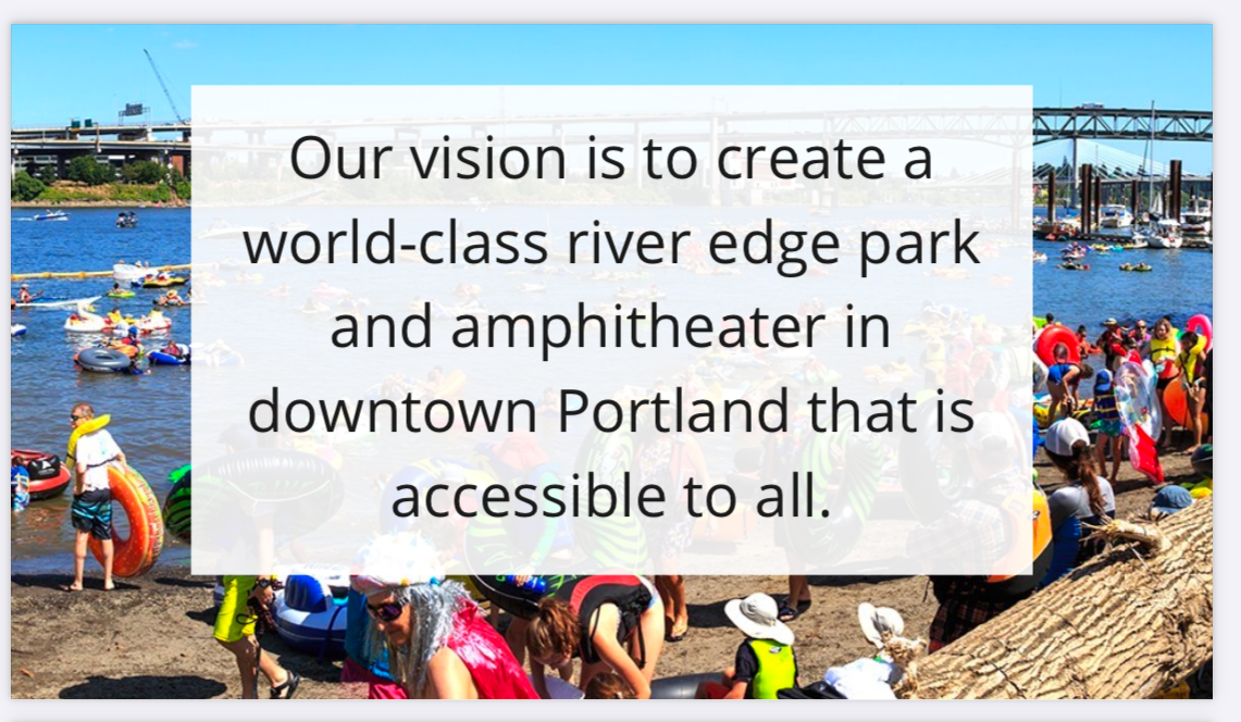 Our vision is to create a world-class "toes in the water" river edge park that facilitates robust activation {a stage with more music by the river} in downtown Portland.
